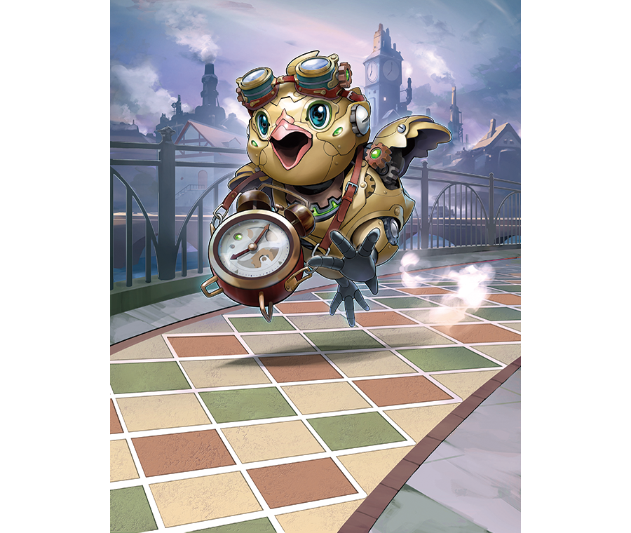 在小鳥——齒輪獸 麟子鳳雛的齒輪雛雞——的背景中,一批尖塔正在向外伸展,移動並噴出蒸汽。