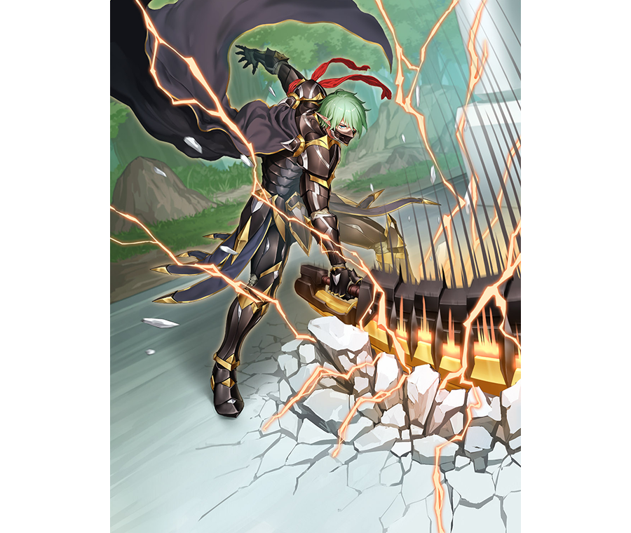 轟破的騎士 貝斯爾汀有點浮誇地回答。黑色鎧甲、大劍、淺綠色頭髮。暗影騎士團的貝斯爾汀左臂上的紅布是反抗天上——「破天」——的標誌。