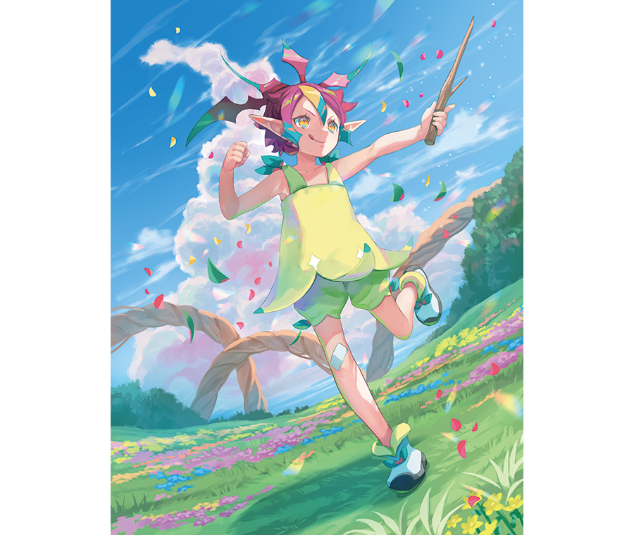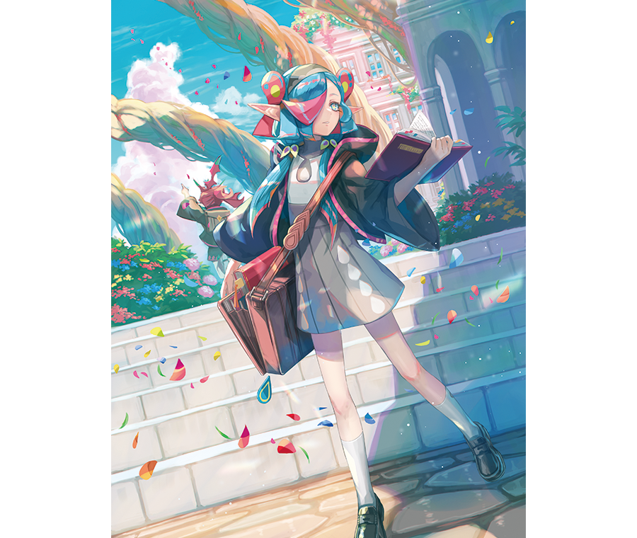 與她的藍色頭髮、紅色髮飾和嬌小苗條的身材相比,背著的包大得不成比例。包裡裝滿了書、石頭和藥草(但擺放整齊)。
