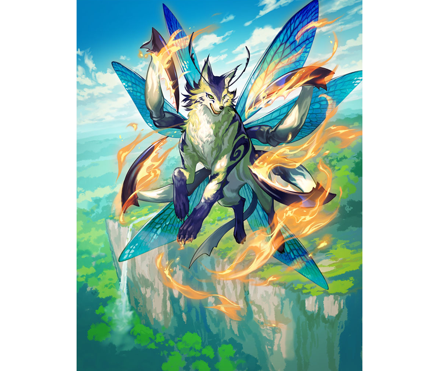 在寶珠所描繪的未來景象中,飛在朱霧森林維秘斯姆天空中的高等獸 勸告螳狼正面對著兩人。