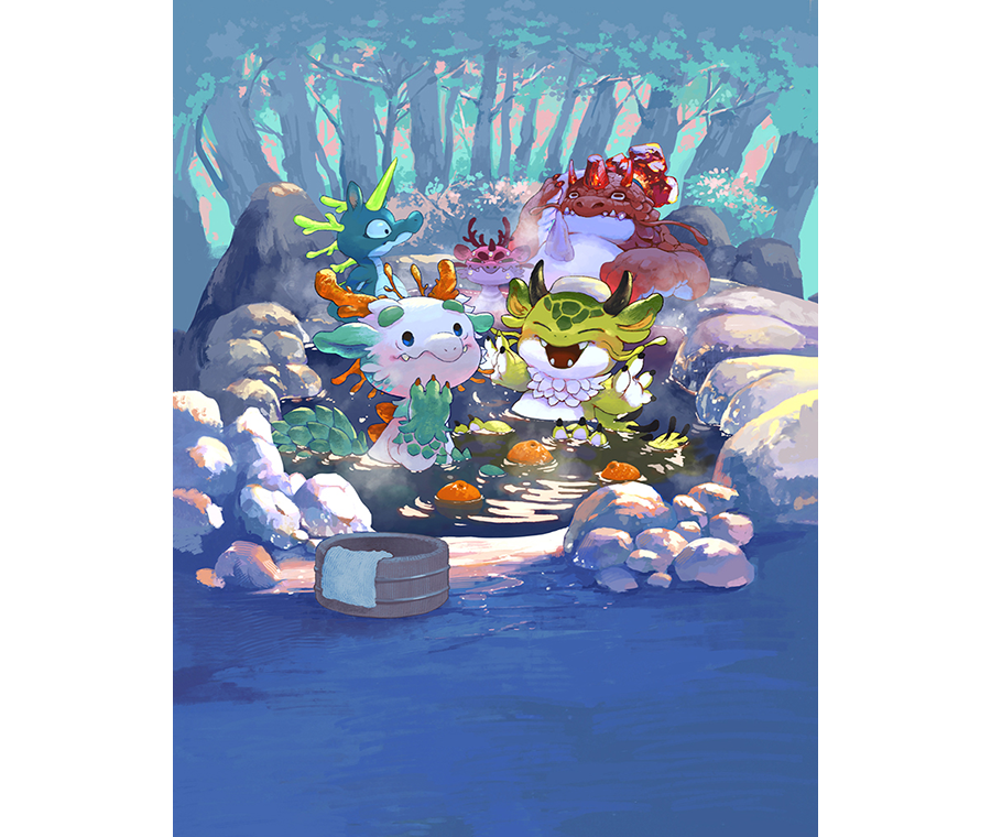 不少雄性的龍族在寬闊溫暖、冒著蒸汽的溫泉中休憩。