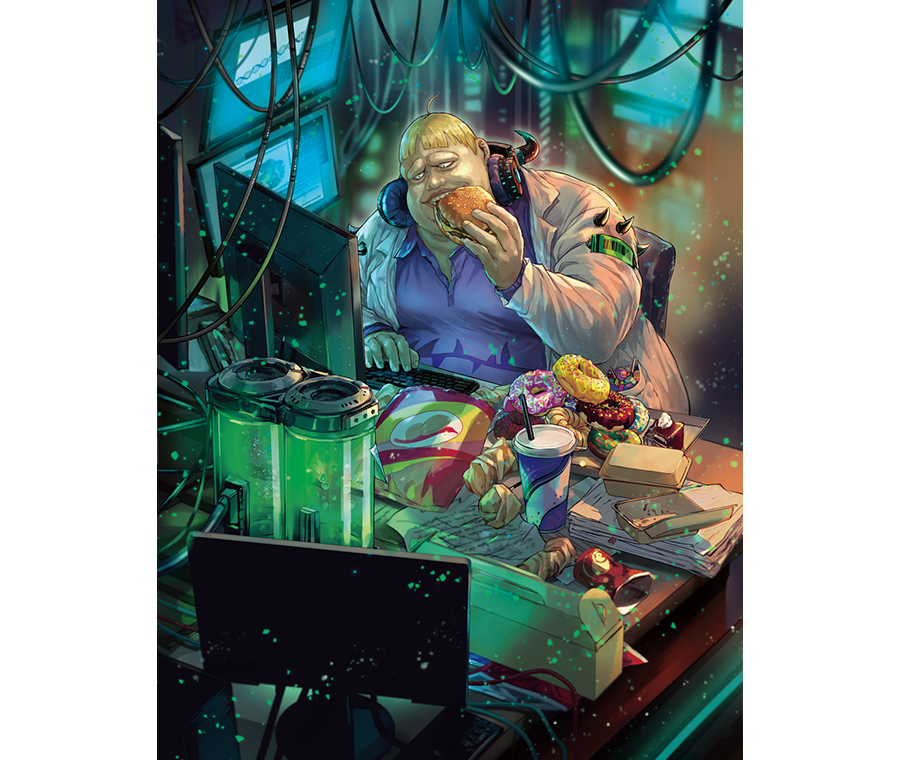 大魔法師貝爾克蕾婭透過玻璃,有點不適地看著監控室裡的瑞谷萊恩研究員 食夢靈的樣子。他正一邊吃著垃圾食物,一邊敲著鍵盤。